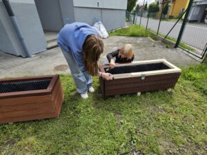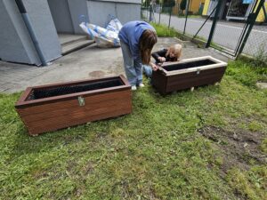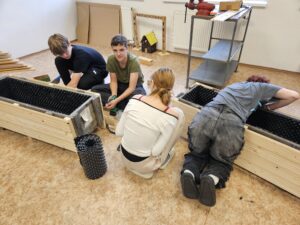 Výroba vyvýšených květinových truhlíků byla zahájena již v zimních měsících. Využili jsme zkušenosti z výroby vyvýšených záhonů do skleníku v minulých letech. Žáci 8. a 9. ročníků vyrobili pevnou deskovou konstrukci, kterou opatřili opláštěním ze smrkových palubek. Vnitřní část byla zajištěna nopkovou folií a vystlána listím, klacky, větvemi, organickými zbytky. Do horní části byla nasypána hlína a zasazeny květiny.