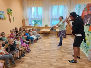 Nový školní rok jsme zahájili v naší MŠ prvním zářijovým divadélkem a vyprávěním příběhu o cvrčkovi, který se vrátil z cesty po světě a hledal na paloučku kamarády, kteří by hráli v jeho kapele. Byla to moucha Cecilka, housenka Mařenka a čmelák Brunda.