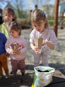 Zapojily se do sázení, pracovaly s hlínou a dodržovaly dostatečné rozestupy tak, aby si rostliny nepřekážely a mohly se dostatečně vyvinout.