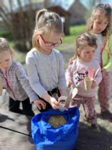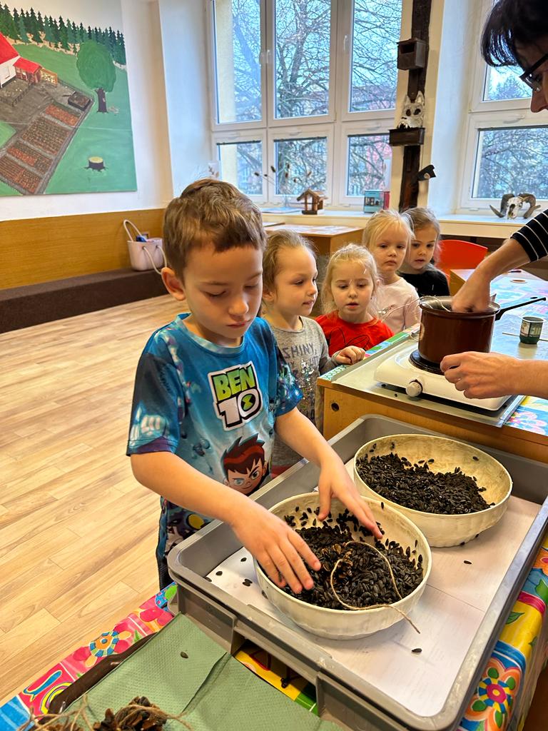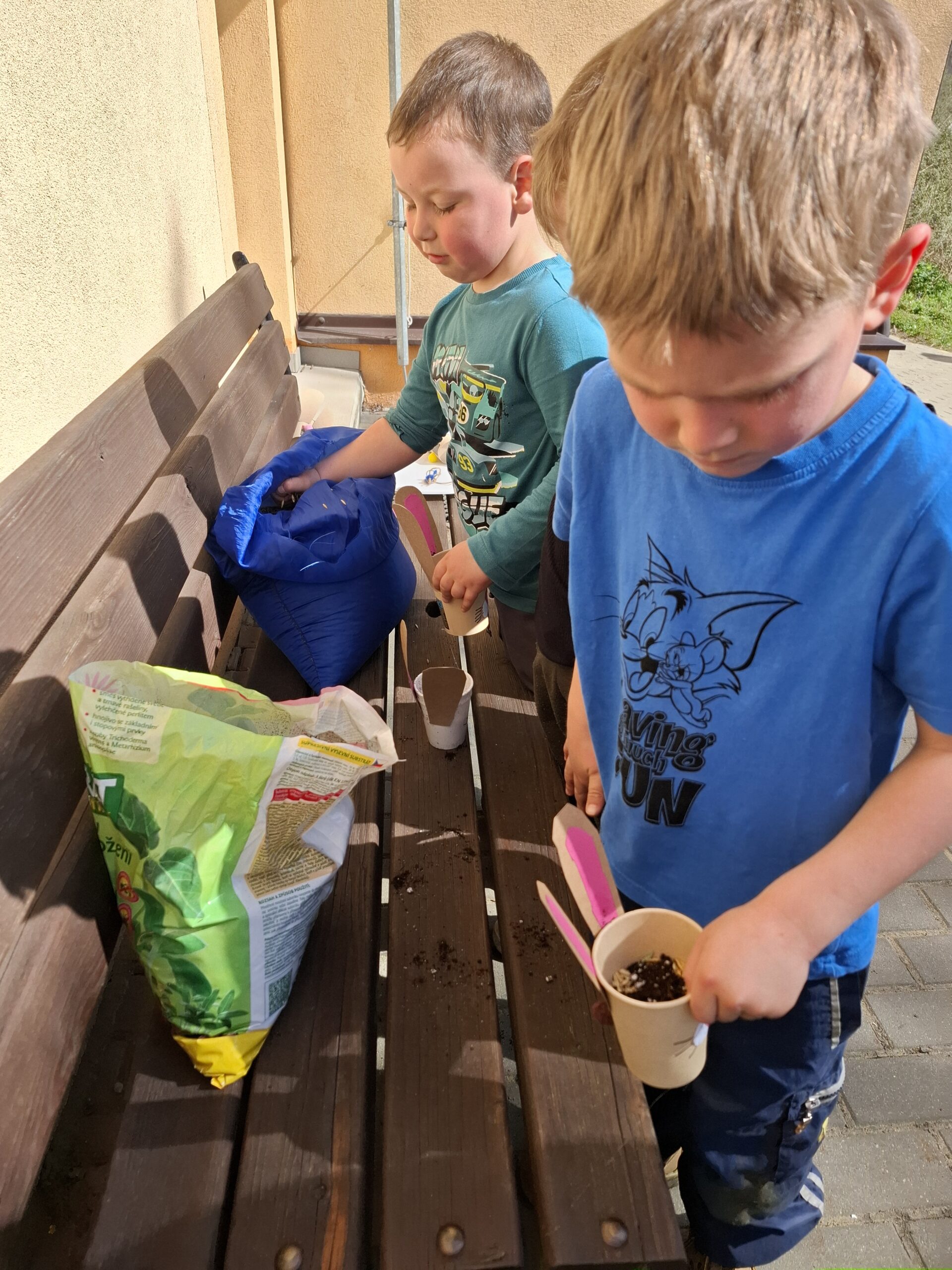 V rámci tématu „Pohádková louka“ jsme využili krásného počasí a s dětmi probudili květinový záhonek . Děti se zábavnou formou učily poznávat a pojmenovávat první jarní květiny a jejich části.
