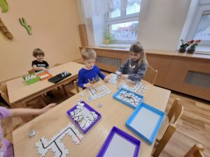 Hlavními pomocníky se stali roboti Bee-Bot a Ozobot, kteří dětem přiblížili základy programování bez nutnosti práce s počítačem. Bee-Bot děti zaujal jednoduchým ovládáním pomocí tlačítek, díky kterému se učily plánovat trasu, přemýšlet nad posloupností kroků a opravovat případné chyby. Ozobot zase nabídl možnost programování pomocí barevných kódů. Děti s nadšením kreslily trasy, zkoušely různé kombinace barev a sledovaly, jak robot reaguje na jejich pokyny. Tím si přirozeně osvojovaly základní principy algoritmického myšlení. Děti pracovaly samostatně i ve skupinkách, vzájemně si pomáhaly a s radostí objevovaly, že programování může být zábava. Robohrátky ukázaly, že moderní technologie mají své místo i ve vzdělávání těch nejmenších a mohou rozvíjet jejich kreativitu, logiku i spolupráci.