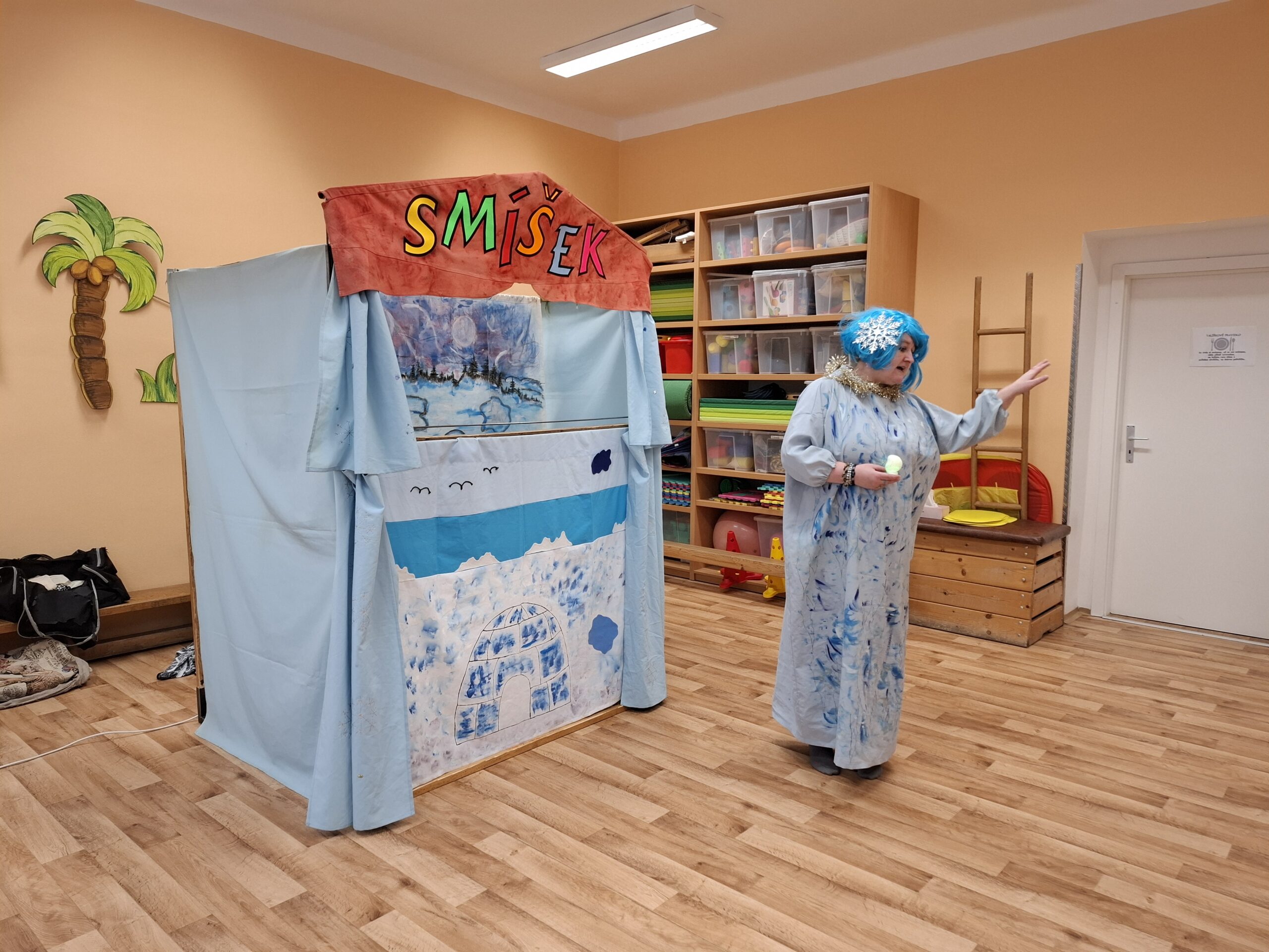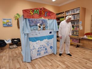 Ve čtvrtek 8.1.2026 k nám do MŠ zavítalo divadélko Smíšek s představením Eskymácká pohádka. Už samotný název napovídal, že se vydáme do světa sněhu, ledu a dalekého severu. Pohádka nás zavedla mezi Eskymáky, kde jsme se seznámili s jejich způsobem života, zvyky i každodenními starostmi. Hlavními postavami byly loutky, které herci velmi šikovně ovládali a dodávali jim výraz i emoce. Díky tomu byl příběh srozumitelný, zábavný a dobře pochopitelný i pro menší děti. Představení bylo plné veselých momentů, ale zároveň v sobě neslo i poučení. Ukazovalo například důležitost přátelství, vzájemné pomoci a respektu k ostatním. Scéna i rekvizity byly jednoduché, ale nápadité, a společně s hudbou dokázaly navodit dojem mrazivé eskymácké krajiny. Celé vystoupení bylo živé, hravé a velmi poutavé.