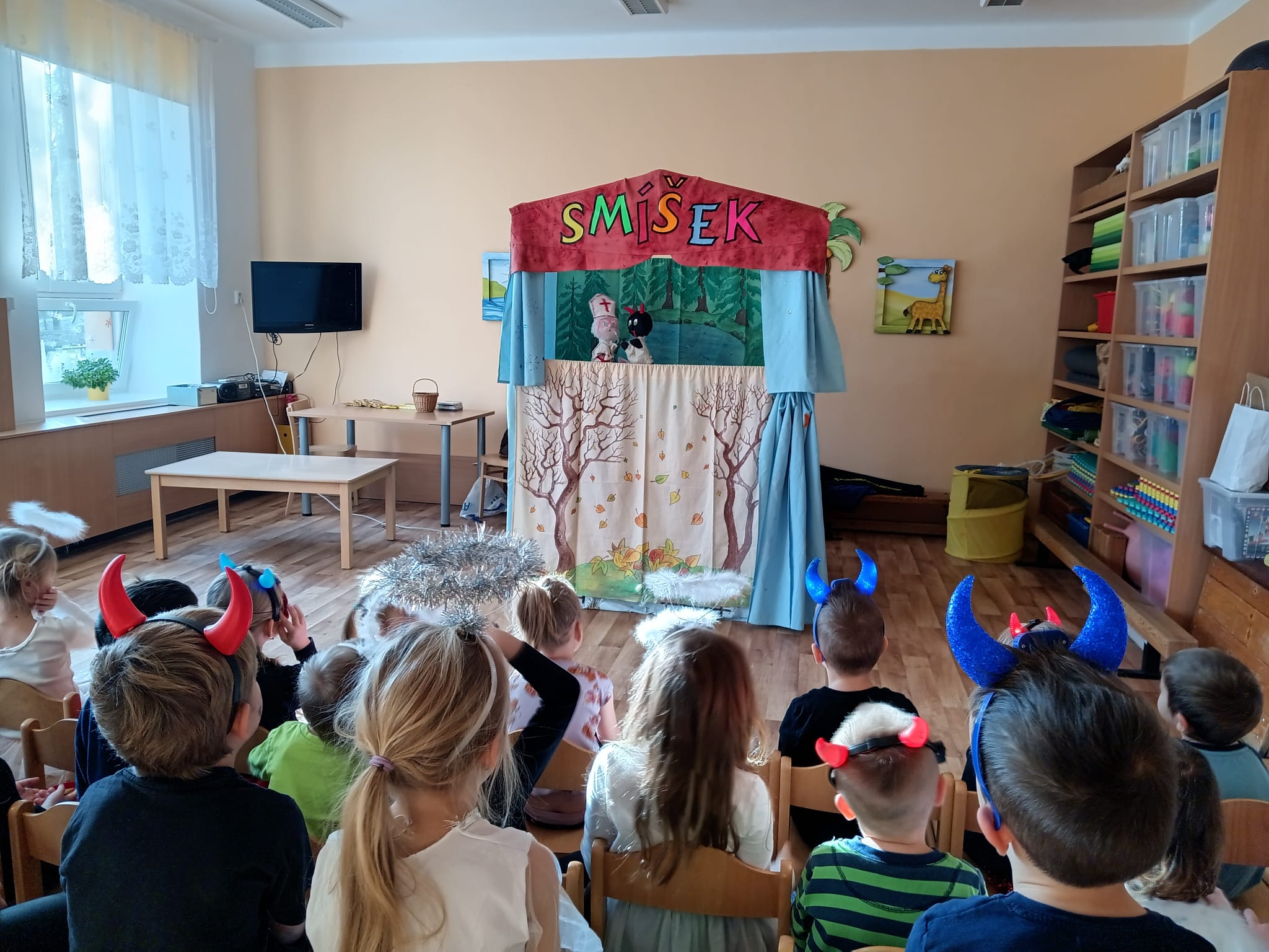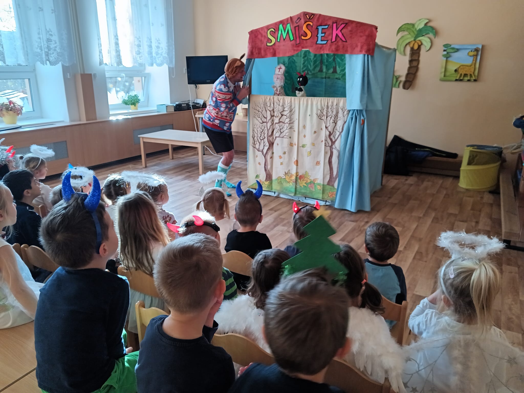 Ve čtvrtek 4.12.2025 jsme v naší MŠ přivítali oblíbené Divadélko Smíšek, které si pro děti připravilo veselou a poutavou pohádku. Malí diváci se od prvních minut nechali vtáhnout do děje, společně s herci zpívali, smáli se a aktivně se zapojovali do příběhu. Atmosféra byla plná radosti a zvědavosti.