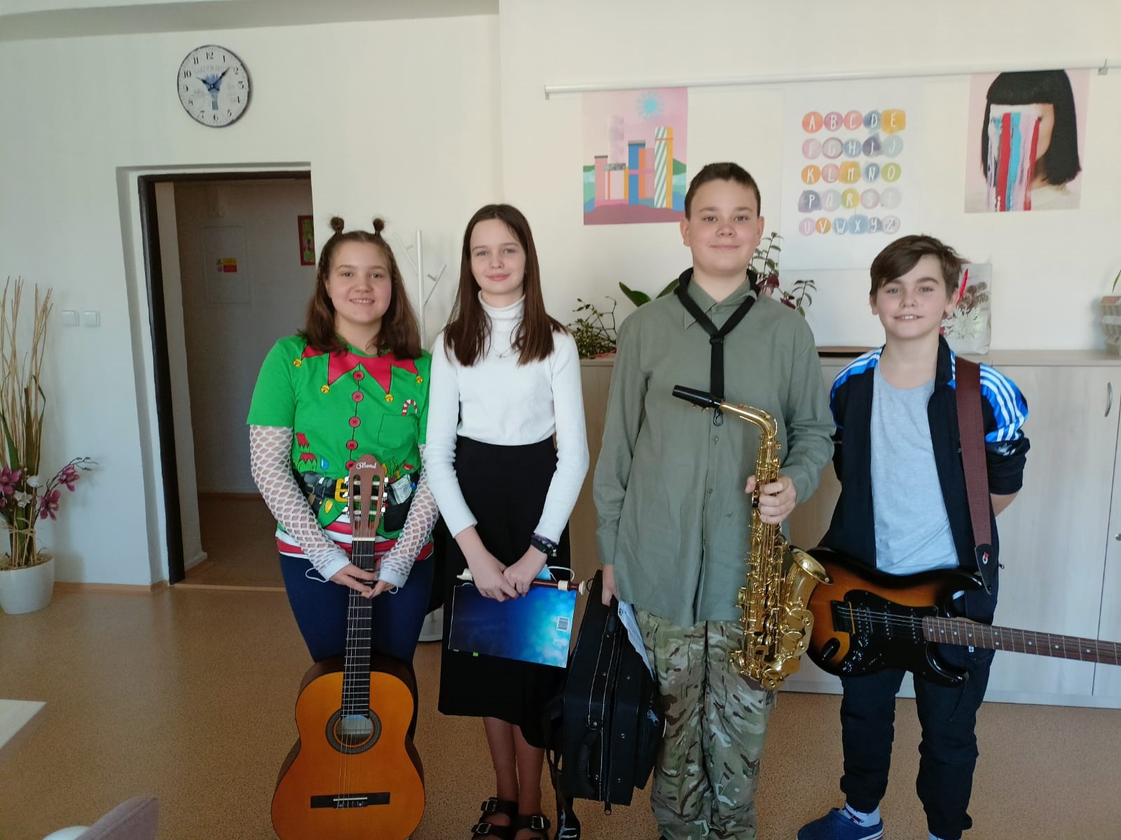 V důsledku hygienických opatření se letos nemohl uskutečnit náš tradiční vánoční koncert v tělocvičně a proto jsme se rozhodli, že potěšíme naše spolužáky a nacvičili jsme krátké vystoupení do školního rozhlasu. Žáci a žákyně ze tříd 6. A., 6. B a 7. A zahráli na hudební nástroje vánoční skladby a zpříjemnili nám všem předvánoční atmosféru ve třídách.
